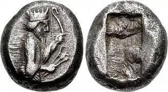 Aunque muchas de las monedas más antiguas de la antigüedad mostraban imágenes de divinidades o figuras humanas simbólicas, los primeros retratos de gobernantes vivos aparecieron con estos temas satrápicos aqueménidas, en el siglo V a. C., en particular con las monedas de Licia.[43][44] Ya antes del año 500 a. C., los aqueménidas habían sido los primeros en representar la persona de su rey o un héroe en sus dáricos y siclos, de manera estereotipada, mostrando un busto o cuerpo completo, pero nunca con un retrato real.[27][28][44]