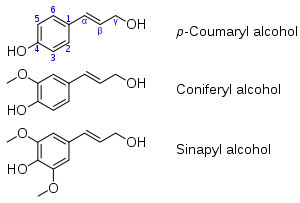 Los monolignoles, también llamados lignoles, son los materiales de origen para la biosíntesis de lignanos y lignina.[1] La síntesis de los monómeros de lignina (monolignoles) comienza con la desaminación del aminoácido natural fenilalanina para formar ácido cinámico; posteriormente, una serie de hidroxilaciones y subsecuentes reacciones de O-metilación modifican los anillos aromáticos del ácido cinámico, reduciendo su cadena lateral de un ácido a un alcohol. Esto da como resultado la producción de los monolignoles: alcohol p-cumarílico (4-hidroxicinamílico), alcohol coniferílico (3-metoxi 4-hidroxicinamílico) y alcohol sinapílico (3,5-dimetoxi 4-hidroxicinamílico); éstos difieren en su grado de metoxilación. El alcohol coniferílico presenta un grupo metoxilo (-OCH3) en la posición 3 del anillo aromático, el sinapílico dos metoxilos en sus posiciones 3 y 5, y el p-coumarílico carece de sustituyentes en su anillo aromático. Después de su incorporación al polímero de lignina, estos monómeros se designan como sus subunidades p-hidroxifenil (H), guaiacil (G) y siringil (S), respectivamente, y su disposición y abundancia determinan las propiedades físicas de la pared celular.[2]