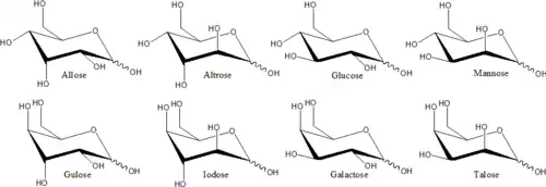 Cada átomo de carbono que soporta un grupo hidroxilo es quiral, excepto los que se encuentran al final de la cadena. Esto da lugar a una serie de formas isoméricas, todas con la misma fórmula química. Por ejemplo, la galactosa y la glucosa son aldohexosas, pero tienen estructuras físicas y propiedades químicas diferentes.