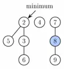 Sin embargo, para completar la extracción del mínimo, necesitamos actualizar el puntero a la raíz con la clave mínima. El problema es que hay n raíces que comprobar. En la segunda fase decrementamos el número de raíces agrupando sucesivamente las raíces del mismo grado. Cuando dos raíces u y v tienen el mismo grado, hacemos que una de ellas sea hija de la otra de manera que la que tenga la clave menor siga siendo la raíz. Su grado se incrementará en uno. Esto se repite hasta que todas las raíces tienen un grado diferente. Para encontrar árboles del mismo grado eficientemente usamos un vector de longitud O(log n) en el que guardamos un puntero a una raíz de cada grado. Cuando una segunda raíz con el mismo grado es encontrada, las dos se unen y se actualiza el vector. El tiempo de ejecución actual es O(log n + m) donde m es el número de raíces al principio de la segunda fase. Al final tendremos como mucho O(log n) raíces (porque cada una tiene grado diferente). Así pues el Potencial se decrementa al menos m - O(log n) y el tiempo de ejecución amortizado es O(log n).