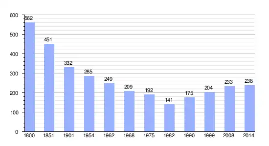 Los datos demográficos contemplados en este gráfico de la comuna de Mont-Bertrand[4] se han cogido de 1800 a 1999 de la página francesa EHESS/Cassini, y los demás datos de la página del INSEE.[5]