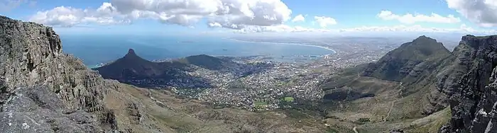 ![]() Vista característica de la Montaña de la Mesa y Ciudad del Cabo desde Bloubergstrand. La Montaña de la Mesa está flanqueada por el Pico del Diablo a la izquierda y la Cabeza de León a la derecha. | ||