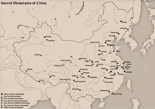 Son muchas las montañas que son consideradas montañas sagradas de China y se refieren a varios grupos de montañas. La expresión «las cinco grandes montañas» (en chino tradicional, 五嶽; en chino simplificado, 五岳; pinyin, Wǔyuè) se refiere a cinco de las montañas más famosas de la historia de China,[1] que fueron objeto de peregrinaje imperial por parte de los emperadores a lo largo de los siglos. Están asociadas con el dios supremo del cielo y las cinco principales deidades cósmicas de la religión tradicional china. Otro grupo asociado con el Budismo se conoce como las «cuatro montañas sagradas del Budismo» (en chino, 四大佛教名山; pinyin, Sì dà fójiào míngshān), y el grupo asociado con el Taoísmo se conoce como las «cuatro montañas sagradas del Taoísmo» (en chino, 四大道教名山; pinyin, Sì dà dàojiào míngshān). Todas las montañas sagradas han sido destinos importantes de peregrinación y la expresión china para peregrinaje (en chino tradicional, 朝聖; en chino simplificado, 朝圣; pinyin, cháoshèng) es una versión abreviada de una expresión que significa «rendir respeto a una montaña sagrada» (en chino tradicional, 朝拜聖山; en chino simplificado, 朝拜圣山; pinyin, cháobài shèng shān).