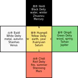 Alternativamente, a veces se hace referencia a esas montañas por las direcciones respectivas: la «gran montaña del Norte» (en chino tradicional, 北嶽; en chino simplificado, 北岳; pinyin, Běi Yuè), «Gran montaña del Sur» (en chino tradicional, 南嶽; en chino simplificado, 南岳; pinyin, Nán Yuè), «gran montaña del Este» (en chino tradicional, 東嶽; en chino simplificado, 东岳; pinyin, Dōng Yuè), «gran montaña Occidental» (en chino tradicional, 西嶽; en chino simplificado, 西岳; pinyin, Xī Yuè) y «gran montaña Central» (en chino tradicional, 中嶽; en chino simplificado, 中岳; pinyin, Zhōng Yuè).
