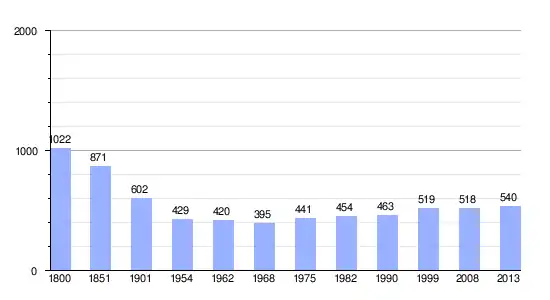 Los datos demográficos contemplados en este gráfico de la comuna de Montchaude[4] se han cogido de 1800 a 1999 de la página francesa EHESS/Cassini, y los demás datos de la página del INSEE.[5]