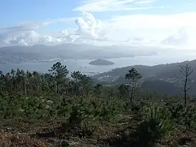 ![]() Vista de la ría de Pontevedra desde Monte Castrove con Combarro, la isla de Tambo y Marín al fondo. | ||