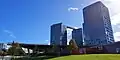 El complejo se asienta sobre una base de marga rocosa.[19] Los tres niveles bajo rasante están ejecutados con hormigón armado in situ, cimentación aislada, lo que aporta una mayor estabilidad, estanqueidad y protección contra el fuego.[19][20] En el caso de los edificios tiene una zapata central de 1.000 metros cúbicos de hormigón. Los forjados de las plantas bajo rasante, que en su parte superior forman las plazas del complejo, son reticulares de casetón recuperable con 50 centímetros de canto y preparados para el acceso de vehículos de bomberos hasta el pie de los edificioos.[19]