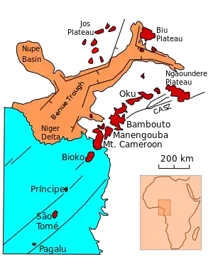 - Kevin Burke (2001). «Origin of the Cameroon Line of Volcano-Capped Swells». The Journal of Geology 109: 349-362. Bibcode:2001JG....109..349B. doi:10.1086/319977. Consultado el 1 de febrero de 2011.
