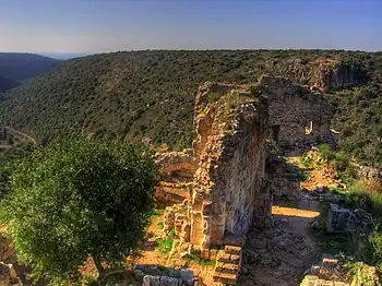 Montfort se encuentra en un afloramiento rocoso conocido como al-Qurayn[4] "el Cuerno" en un valle regado por el Wadi Qurayn "río del Cuerno" en árabe y Nahal Keziv[5] en hebreo.