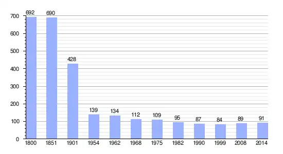 Los datos demográficos contemplados en este gráfico de la comuna de Montmorin[4] se han cogido de 1800 a 1999 de la página francesa EHESS/Cassini, y los demás datos de la página del INSEE.[5]