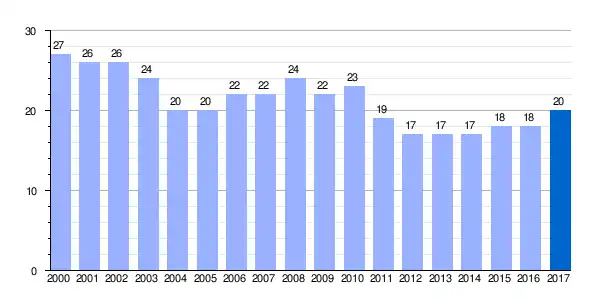| Gráfica de evolución demográfica de Montoria[2] entre 2000 y 2017 |