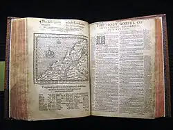 - Se trataría de la conocida Geneva Bible (Biblia de Ginebra), una edición «de bolsillo» (218 × 139 mm) en lengua inglesa, publicada por William Whittingham (c. 1524-1579) en 1560.