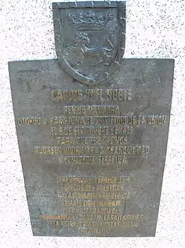 En la placa metálica del pedestal, con el escudo de Pamplona en la parte superior, mirando hacia la Plaza del Castillo, se lee en español: