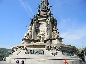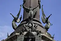 | Carabelas y figuras aladas | Francisco Font (boceto), Rossend Nobas (modelo) | Bronce | 4,40 x 2,45 x 1,50 | En la base de la columna figuran cuatro grupos de carabelas con dos grifos cada uno, que sostienen el escudo de Barcelona, y cuatro semiesferas con gaviotas sobre las que se alzan cuatro Famas aladas, que ofrendan coronas de la inmortalidad al personaje homenajeado, Cristóbal Colón. La Fama como figura femenina alada fue un símbolo iconográfico profusamente utilizado para la escultura conmemorativa en todo el siglo XIX.[15] | ![]() |