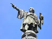 | Luis de Santángel | Josep Gamot (boceto), Giovanni Passani (realización) | Piedra caliza | 3,15 x 1,91 x 1,26 | En el pedestal, entre las figuras alegóricas de los reinos de España, se hallan cuatro estatuas dedicadas a personajes vinculados con la historia de Colón. El dedicado a Luis de Santángel, consejero y escribano de ración de los Reyes Católicos, que financió buena parte de los gastos de la expedición americana, es una figura ataviada con suntuosos ropajes, con un cofre en la mano y una bolsa de dinero sujeta al cinto, en virtud de inversor de la empresa colombina. El tratamiento dado a la figura es realista, siguiendo una moda de la época consistente en representar a personajes históricos de forma naturalista, para hacerlos más cercanos al espectador. Esta estatua formaba grupo con otra de un paje, desaparecida en fecha incierta. La obra fue restaurada en 1965 por Josep Miret.[17] |