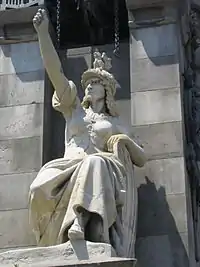 | Alegorías de los reinos de España | Pere Carbonell (Cataluña), Josep Carcassó (Aragón), Josep Gamot (Castilla) y Rafael Atché (León); Josep Miret (restauración) | Piedra de Monóvar | 3,40 x 1,40 x 2,40 (Cataluña), 3,95 x 1,10 x 1,77 (Aragón), 3,50 x 1,90 x 1,30 (León), 3,85 x 1,60 x 1,40 (Castilla) | En el pedestal del monumento se encuentran cuatro estatuas alegóricas de los reinos medievales de España (Aragón, Castilla y León, más Cataluña como región de la que es capital Barcelona). Se trata de cuatro figuras femeninas en actitud sedente, con los atributos de la realeza, como la corona y el cetro. La más fácilmente identificable es la de Cataluña, por el escudo con las cuatro barras. Las cuatro presentan una uniformidad estilística cercana al realismo formal, pese a ser de autores diferentes. Las cuatro figuras fueron restauradas en 1965 por Josep Miret.[14] | ![]() |