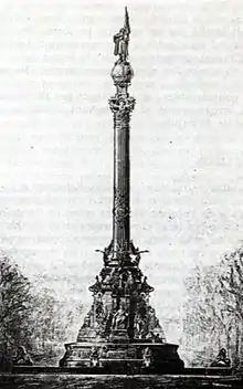 La idea de erigir un monumento dedicado al descubridor de América había surgido tiempo atrás, cuando a mediados del siglo XIX se pensó coronar con una estatua del navegante la columna erigida en la plaza del Duque de Medinaceli, que finalmente se dedicó al almirante Galceran Marquet, obra de Francisco Daniel Molina, Damià Campeny y Josep Anicet Santigosa, de 1851.[3] El proyecto surgió de nuevo en 1873, en tiempos de la Primera República, siendo el lugar escogido el Portal de la Paz —en aquel entonces Plaza de la Junta Revolucionaria—. Sin embargo, el cambio de régimen y la llegada de Alfonso XII al trono retrasaron el proyecto.[4] El plan resurgió en 1881, impulsado por Antoni Fages i Ferrer, un promotor de iniciativas culturales aficionado a todo lo relacionado con el descubrimiento de América. Este convenció a Carles Pirozzini, un crítico de arte y funcionario municipal, así como uno de los secretarios de la Exposición Universal de 1888, el cual transmitió la idea al alcalde Francisco de Paula Rius y Taulet. Tras el visto bueno del alcalde, el 10 de mayo de 1881 se creó la comisión promotora, que estaba presidida por el propio Rius y Taulet, mientras que Pirozzini ejercía como secretario. El proyecto fue aprobado por el Ayuntamiento de Barcelona el 6 de septiembre de 1881, y el día 26 de ese mismo mes se colocó la primera piedra del monumento.[5]