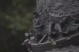 La escultura está hecha de bronce, puesta sobre un pedestal de granito y piedra caliza; la acompaña un obelisco del mismo material. En los costados del pedestal, tiene escenas históricas esculpidas en fierro y una proa de buque. Está rodeada por una pileta con chorros de agua que salen por la boca de leones.