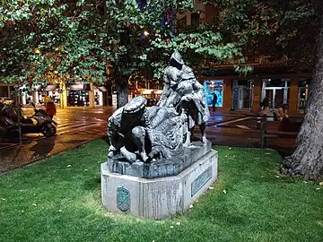 En 1950, el escultor Áureo Rebolé realizó una réplica de esta pieza original en bronce «a través de un vaciado que hizo de la pieza original»,[5] utilizando piedra caliza y piedra artificial. Ocupaba el mismo lugar que la actual. En los inicios de los años noventa, actos vandálicos mutilaron las figuras del conjunto[6] por lo que el Ayuntamiento de Pamplona decidió pasarlo a bronce.[5]