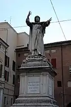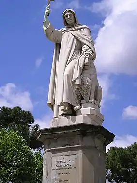 - En el centro de la Plaza Savonarola en Ferrara, se encuentra la estatua a Savonarola realizada por Stefano Galletti colocada sobre una base de mármol blanco en 1875. Representa al fraile con los brazos levantados en una de las muchas invectivas que caracterizaron su actividad como predicador.