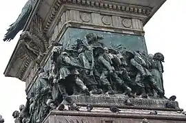 En la base se encuentran además dos leones acostados sobre las escalinatas laterales que tienen una pata cada uno sobre una placa que tiene inscritos los nombres «Roma» y «Milano», en referencia a las grandes conquistas del Risorgimento.
