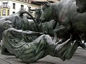 Es un impresionante monumento en homenaje a los encierros de los Sanfermines. Representa con un realismo la expresividad y dinamismo de un momento agitado del encierro en el que los corredores están siendo alcanzados por los toros. «La escultura debía de ser una instantánea del encierro y expresar acción, una estampida», declaró el Rafael Huerta.[1]