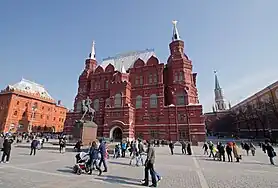 El monumento visto desde un lateral con el Museo Histórico Estatal de Moscú al fondo