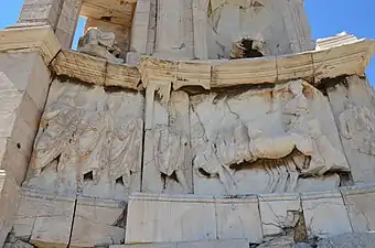 Cabe resaltar que la cuadriga contiene una pequeña figura perteneciente a Heracles dentro de un templete o naiskos.[16] En la parte posterior de la cuadriga hay una figura siguiéndola, mientras que las riendas de los caballos están sujetados por un mozo de cuadra. Más a la izquierda están esculpidos seis lictores, oficiales públicos encargados de escoltar magistrados. Todas las figuras han sido decapitadas, o bien su cara ha sido rota.[17] Parece que en la parte derecha, ahora desaparecida, habrían seis lictores más. [4]
