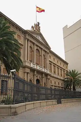 El edificio se construyó en 1879, con influencia de modelos de palacios italianos dentro del estilo del neoclasicismo palladiano. El edificio está dividido en dos plantas con una fachada de tres partes, la central con tres arcos de medio punto enmarcados por columnas formando dos arcos de triunfo superpuestos, con un remate de un frontón donde se encuentra un relieve que representa a Minerva y diversos atributos militares. Sobre este frontón se encuentra un gran escudo de España sostenido por leones.