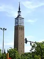 En 1944 se inauguró la seña de identidad del recinto ferial. La atalaya-faro, de 59 metros de altura, culminada con un chapitel de plomo, el cual albergaba un faro y un león como veleta. De perfil clásico semejante a la torre de San Pablo, la de la Feria de Muestras contaba con un elemento intermedio acristalado donde se deposita el reflector que, a modo de faro, hacía de reclamo a la modernidad necesaria, a la industria, como motor de la ciudad. Los arquitectos, apoyándose en una arquitectura del ladrillo de tradición múdejar, introdujeron en el plano de la torre una ordenación geométrica a base de casetones, que ayudan a establecer un muro nada monótono