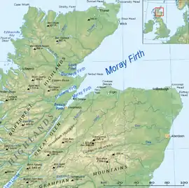 El interior del fiordo de Moray es visible desde distancias considerables, incluyendo una vista desde el este, en la lejanía, desde el monumento prehistórico de Longman Hill.[1]
