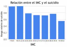 La asociación entre la obesidad y la depresión es más fuerte en aquellos que son más severamente obesos, los que son más jóvenes y las mujeres.[54] Sin embargo, la tasa de suicidio disminuye con el aumento del IMC.[53] De manera similar, la pérdida de peso a través de la cirugía bariátrica se asocia con un mayor riesgo de suicidio.[55]