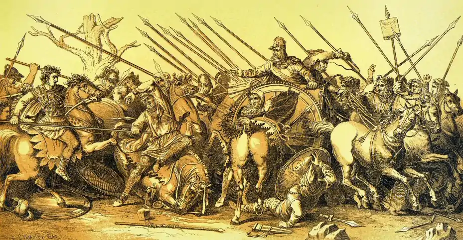 A Darío, por su parte, se le muestra en su carro. Parece estar dando órdenes desesperadamente al auriga real para huir de la batalla, mientras extiende su mano como un gesto mudo hacia Alejandro, o posiblemente tras haber lanzado una jabalina.[18] Tiene una expresión preocupada y ansiosa en su rostro.[11] El auriga da latigazos a los caballos mientras intenta escapar. Los soldados persas situados detrás de él expresan arrojo y consternación.[10]