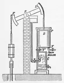 El primer motor de balancín relacionado con el vapor fue desarrollado por Thomas Newcomen. Estrictamente hablando, no estaba impulsado por vapor, ya que el vapor introducido debajo del pistón se condensaba para crear un vacío parcial, permitiendo así que la presión atmosférica empujase hacia abajo el pistón. Por lo tanto, después se le ha denominado motor atmosférico. El motor atmosférico Newcomen fue adoptado por muchas minas en Cornualles y en otros lugares, pero era relativamente ineficiente y consumía una gran cantidad de combustible. John Smeaton mejoró el motor, pero James Watt resolvió las principales ineficiencias del motor Newcomen en su máquina de vapor Watt, mediante la adición de un condensador separado, permitiendo así que el cilindro permaneciese caliente.