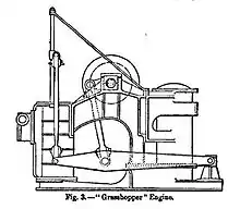 El saltamontes o motor de 'media leva'[10] era una variante del motor de leva lateral. Se diferencia de la palanca lateral convencional en que la ubicación del pivote de la palanca y la biela estaban más o menos invertidas, con el pivote ubicado en un extremo de la palanca en lugar del centro, mientras que la biela está unida a la palanca entre el cilindro en un extremo y el pivote en el otro.[11]