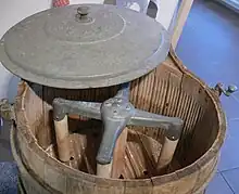 El motor de agua también se utilizó con éxito en "lavadoras", como por ejemplo la firma Miele que los introdujo a partir de 1914. Estas lavadoras, que eran muy comunes especialmente en las áreas rurales hasta la década de 1960, tenían la forma de una tina de madera con un aspa giratoria incorporada en la parte superior. Esta cruz de paletas giraba con movimientos regulares, oscilando de un lado a otro, accionada por dos pistones que estaban conectados a la red de agua.[5] El efecto de lavado se lograba mediante el movimiento constante de la colada en la tina llena de espuma de jabón y/o agua.
