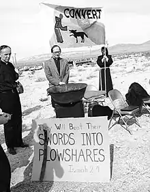 Muchas organizaciones religiosas se han opuesto a las armas nucleares. El rechazo del desarrollo y uso de armas nucleares es "uno de los ideales más compartidos entre todas las doctrinas religiosas".[72] En 1980, algunos grupos religiosos organizaron protestas muy grandes antinucleares que incluyeron cientos de miles de personas y algunos grupos específicos como la Convención Baptista del Sureste y la Iglesia Episcopal. Las comunidades protestantes, católicas y judías publicaron declaraciones antinucleares y en el 2000 la comunidad musulmana comenzó a mostrarse en contra de las armas nucleares.[72]