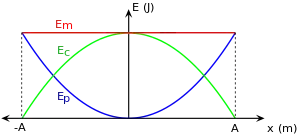 La energía cinética es nula en -A o +A (v=0) y el valor máximo se alcanza en el punto de equilibrio (máxima velocidad Aω).