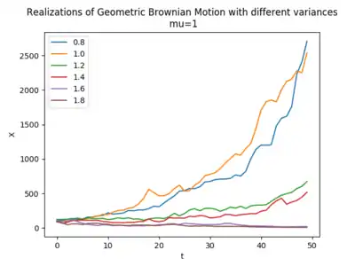 Sean , y , se define el movimiento browniano geométrico como el proceso estocástico a tiempo continuo que satisface la ecuación diferencial estocástica