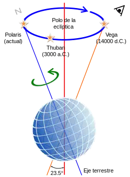 La precesión de los equinoccios (el cambio lento y gradual en la orientación del eje de rotación de la Tierra) se debe al movimiento de precesión de la Tierra causado por el momento de fuerza ejercido por el sistema Tierra-Sol en función de la inclinación del eje de rotación terrestre con respecto al plano de la órbita terrestre (alrededor de 23°43' actualmente). Este movimiento se efectúa por completo cada 25 776 años (por lo que aproximadamente cada 130 siglos se invertirían las estaciones, pero la diferencia entre el año sidéreo y el año trópico es incorporada y corregida por el calendario gregoriano) y un observador en el espacio, situado sobre el polo norte, lo vería como un giro dextrógiro (en el mismo sentido del de las agujas del reloj).
