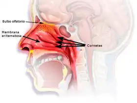 La mucosa nasal es una membrana mucosa que recubre los cornetes y el interior de las fosas nasales. En la zona de los cornetes inferiores y medios, se denomina Pars respiratoria (parte respiratoria). Sirve para limpiar, humedecer y calentar el aire respirado. El revestimiento de la cavidad nasal superior se denomina mucosa olfativa (Pars olfactoria) y sirve para percibir los olores.