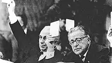 Los partisanos arrestaron a Mussolini y lo llevaron a Dongo, donde pasó parte de la noche en el cuartel local.[26] En ese pueblo, Mussolini se reunió con Petacci, quien había solicitado unirse a él, aproximadamente a las 2:30 a. m. del 28 de abril.[27][28] En total, más de cincuenta líderes fascistas y sus familias fueron encontrados en el convoy y arrestados por los partisanos.[29] Algunos se entregaron espontáneamente, otros intentaron darse la oportunidad de escapar, ofreciendo grandes sumas y bienes a la población local. Los ocupantes de un vehículo blindado intentaron resistirse al disparar, Pietro Corradori y Alessandro Pavolini huyeron saltando al lago, pero fueron recapturados y Pavolini resultó herido. Además de Mussolini y Petacci,[lower-alpha 4] dieciséis de los más destacados serían fusilados sumariamente en Dongo al día siguiente y otros diez serían asesinados en dos noches sucesivas.[32]