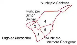 Se encuentra entre los municipios Cabimas y Simón Bolívar al norte, el lago de Maracaibo al oeste, el Municipio Valmore Rodríguez al sur y al este el Estado Falcón y el Estado Lara.