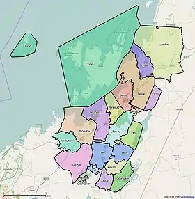 Hasta el año de 2016 el municipio estaba dividido en 4 ciudades: Lugnås, Lyrestad, Mariestad, Sjötorp y Ullervad. A partir de ese mismo año el municipio se divide en los siguientes distritos.