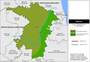 El clima del municipio de Pánuco se divide en dos zonas, la mitad este es Cálido subhúmedo con lluvias en verano y la mitad oeste es Cálido subhúmedo;[9] la temperatura media anual de todo el territorio se encuentra 24 y 26 °C;[10] la precipitación promedio anual del sector noroeste del municipio es de 800 a 1,000 mm, del resto del territorio es de 1,000 a 1,200 mm.[11]