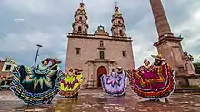 Integrantes de la Academia de Baile "Temachtiani" de San Miguel el Alto frente a la Parroquia de San Miguel Arcángel.