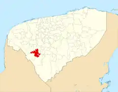 El municipio limita al norte con los municipios de Sacalum y Chapab, al sur con Oxkutzcab, al oriente con Dzan y al poniente con Santa Elena y Muna.