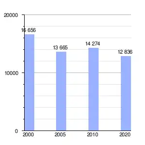 El 49% de la población (6292 personas) eran hombres y el 51% (6544 personas) eran mujeres. Según los datos obtenidos sobre la distribución de la población por franja etaria, el 57.6% de la población (7388 personas) tenían edades comprendidas entre 15 y 64 años.[7]