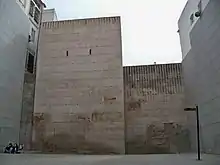 - Integración de alzado y torre exentos en la calle Carretería, número 62-64, visible a pie de calle. La cara interior de la muralla también es visible a la misma altura desde la calle Muro de las Catalinas. Se conservan también restos de la barbacana en esta misma ubicación. Este tramo de muro fue construido en época almohade (siglo XII) y fue restaurado en la década de 1990. En su cara interior presenta aparejo de ladrillo y mampostería, una composición que parece responder más a restituciones del siglo XVIII, cuando se instalaron viviendas sobre la muralla, que a reparaciones de la muralla en sí.[2]:153