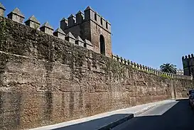 - • Las zonas de tapial realizadas por los almohades, algunas visibles, como en la calle Judería, y calle Agua y otros que no son visibles pues quedan ocultas por las edificaciones de la Calle San Fernando -salvo en algunas que son públicas-. Paralela a la muralla del alcázar, se encontraba la muralla de la ciudad, cuyos restos aparecieron durante las obras del Metro, quedando de nuevo enterrados.[10]